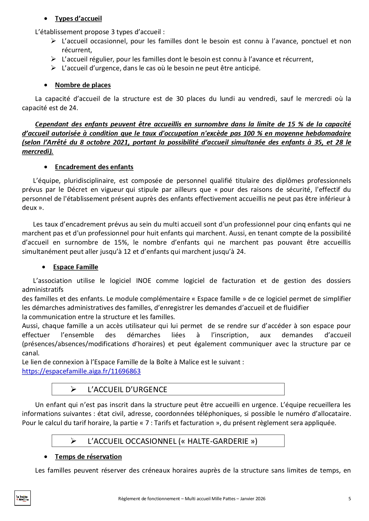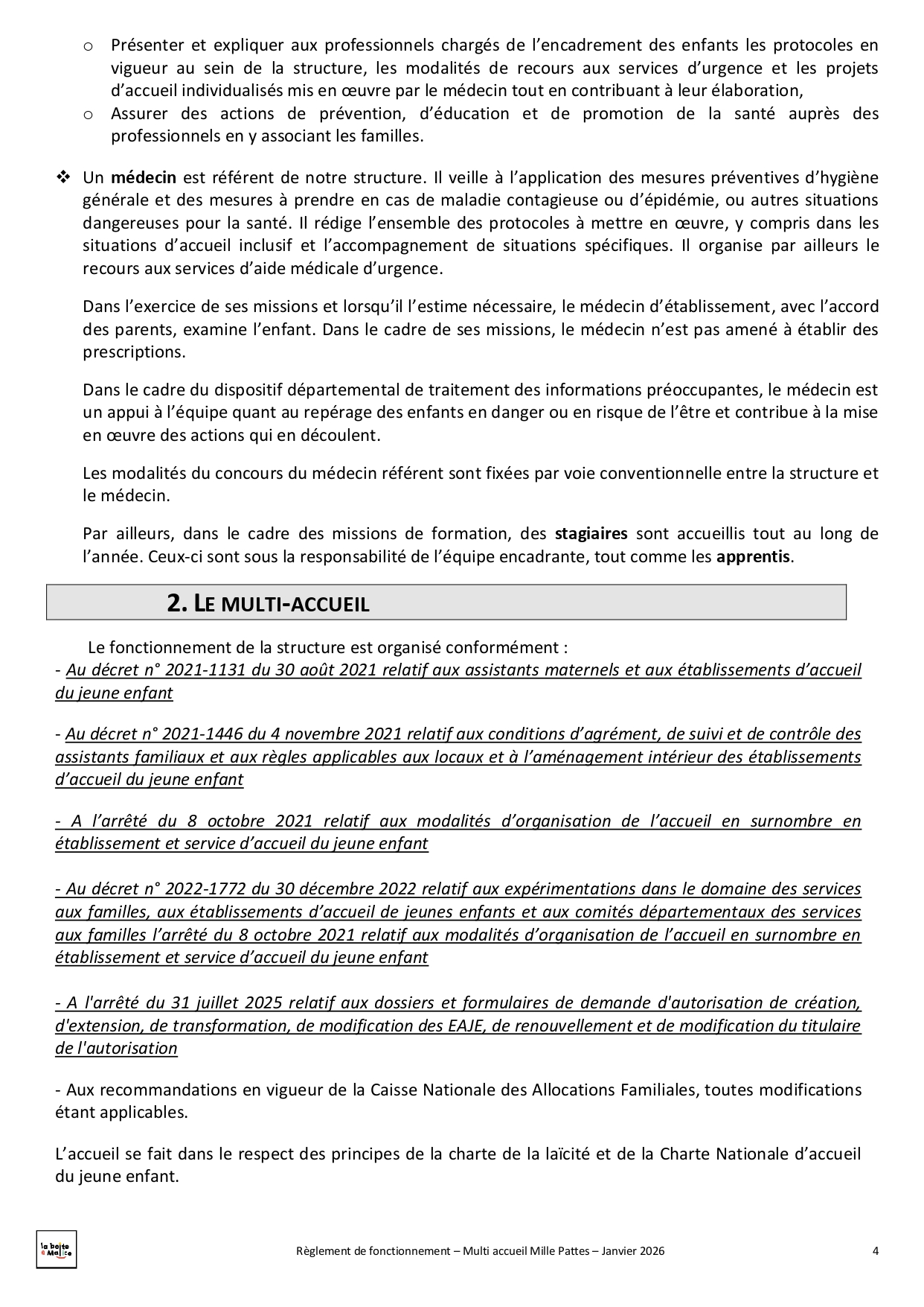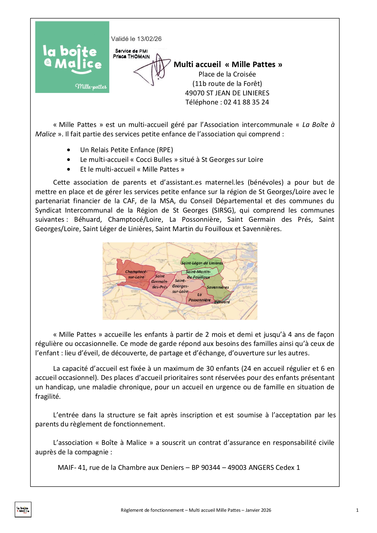 Situé à Saint-Jean-de-Linières, Mille-pattes est un multi-accueil destiné aux enfants de 2 mois ½ à 4 ans. Ils peuvent être accueillis de façon régulière avec 24 places en crèche ou de façon occasionnelle avec 6 places en halte garderie. Au travers de ce mode de garde nous souhaitons répondre au mieux aux besoins des familles ainsi qu'à ceux des enfants : lieu d'éveil, de découvertes, de partage et d'échange, d'ouverture vers les autres.