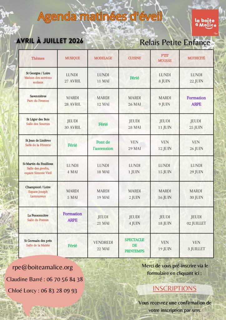 Un dossier de pré-inscription peut être retiré à la Boîte à Malice (5, Rue de Savennières, Centre d'activités de l'Étang, 49170 Saint-Georges-sur-Loire, 02 41 48 45 95).